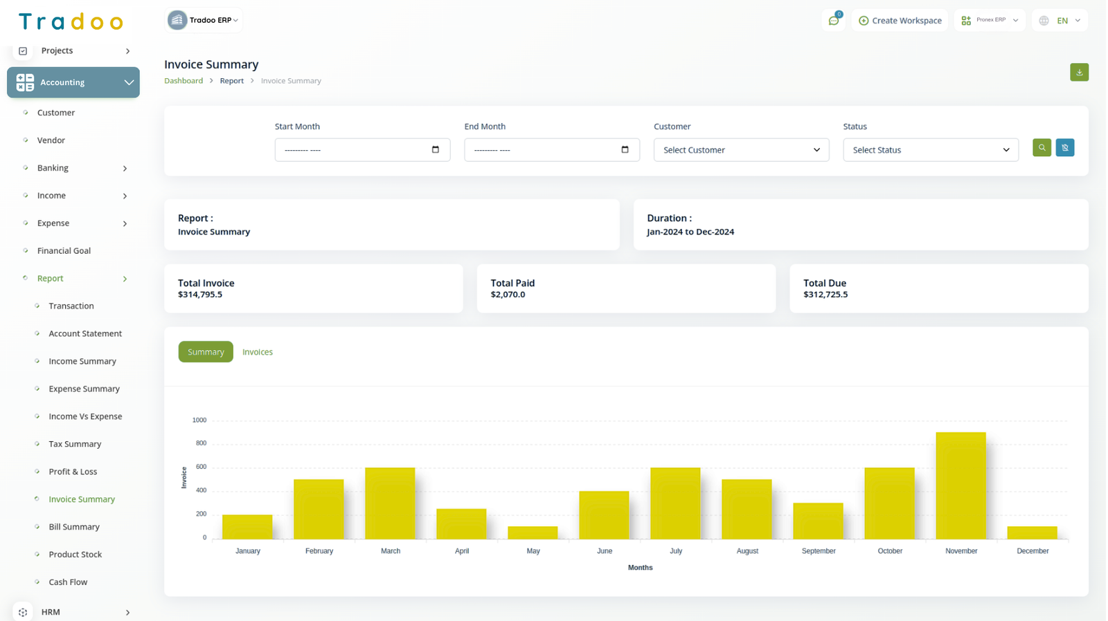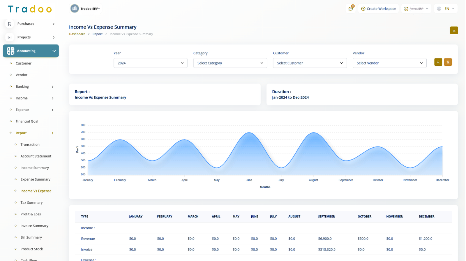 Generate detailed transaction reports with an easy filtering option. Download account statements in PDF, CSV, or Excel formats. Access comprehensive reports on Income, Expenses, Tax, Invoices, and bill summaries, with the ability to filter by Account, category, and customer. A graphical Income vs. Expense chart and a detailed Profit and Loss calculation provide insights for informed decision-making. You can also filter the tax summary and Income vs. Expense chart by financial year.