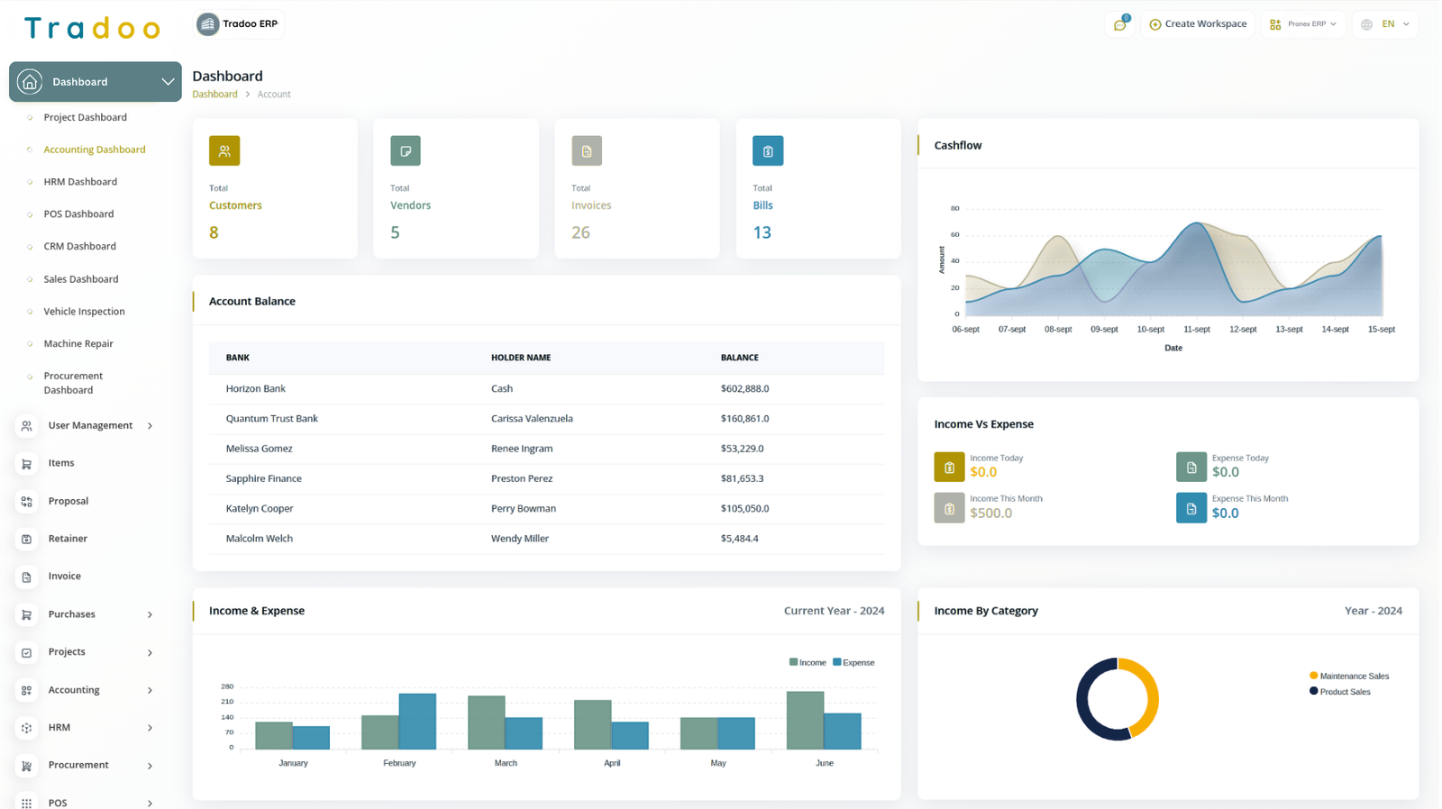 A budget is a financial plan for a specific period that helps maintain control over working capital. This feature allows you to manage cash flow effectively by setting monthly, quarterly, half-yearly, or yearly budgets based on your business needs. The main categories, "Income" and "Expense," allow you to edit, update, or delete sub-categories as required.