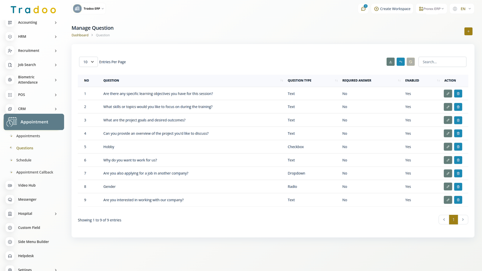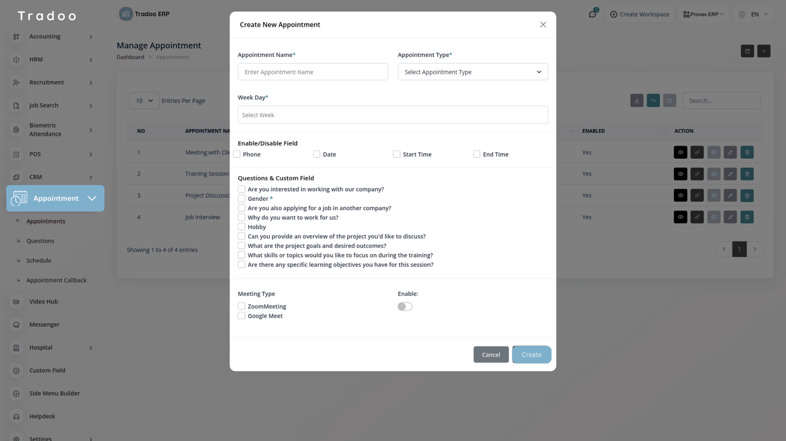 To create custom fields for your appointments, simply select a field and choose the appropriate type from the list. Four field types are available: Text, Radio, Dropdown, and Checkbox. You can easily display the question without additional effort and decide whether to make it mandatory. Additionally, you have the option to determine if the question should appear in the appointment section or not.