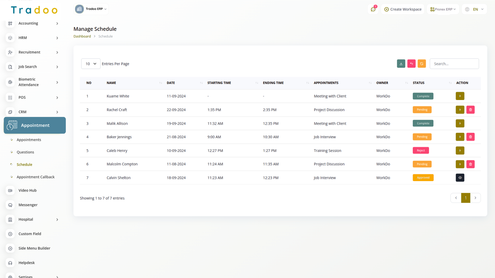 In the schedule section, the details of the filled appointment form are displayed. Here, you can change the schedule status action. The available options include approving or rejecting appointments, assigning users, completing appointments, and sending feedback forms after completion. When an appointment is approved or rejected, the appointee will be notified via email. Additionally, a feedback form will be sent after the appointment is completed.