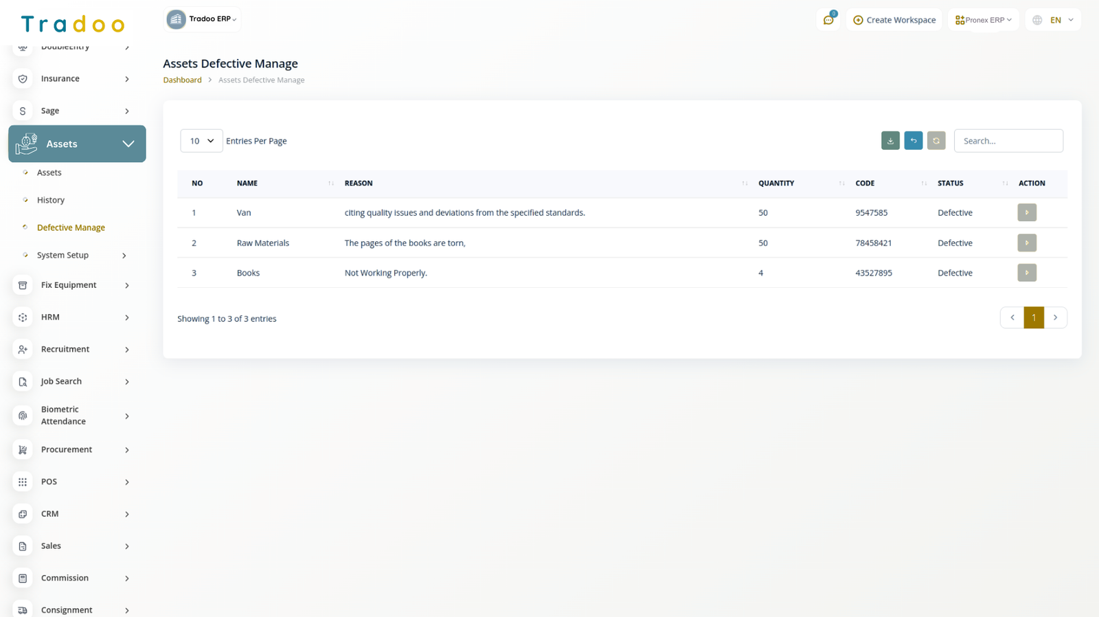 The Defective Assets Management module in Tradoo ERP simplifies the tracking and handling of faulty assets. It allows users to record, categorize, and manage items that do not meet quality standards, ensuring complete documentation, better control, and enhanced accountability across the organization.