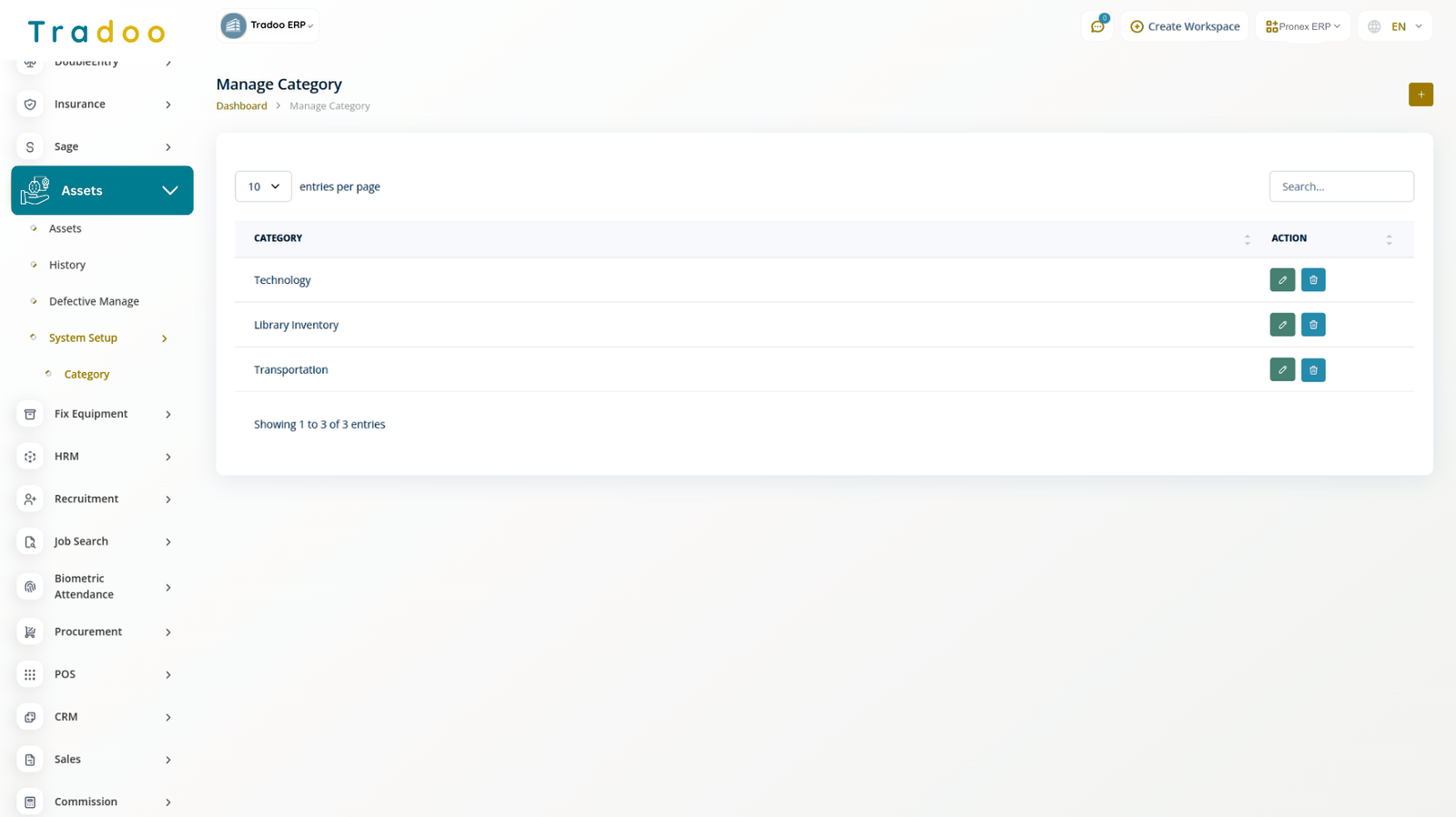 The Asset Category Management module in Tradoo ERP helps organizations efficiently classify and organize their assets. Users can create specific categories like Technology, Library Inventory, or Transportation, making asset tracking and overall management more streamlined and effective.