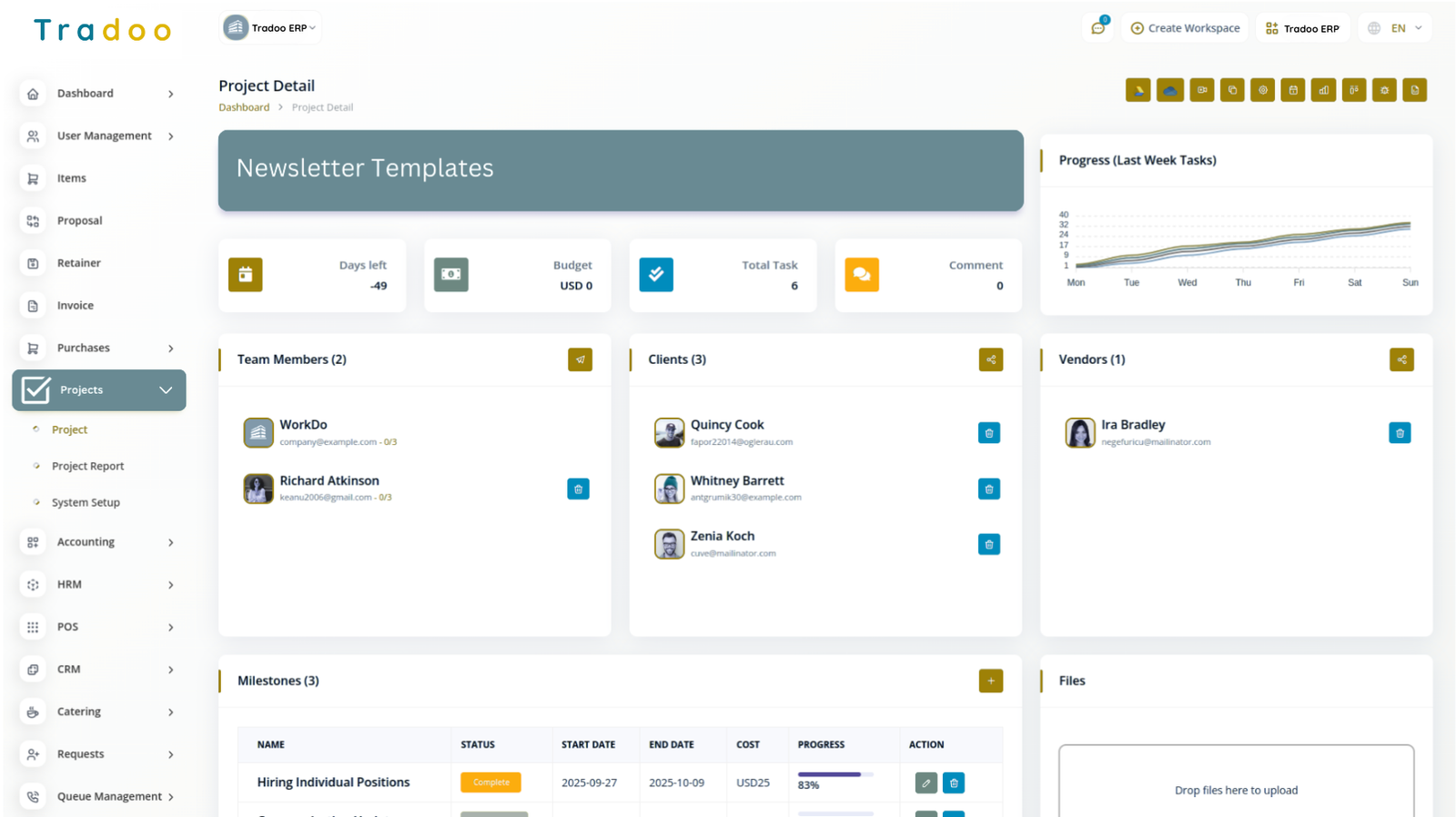 Attach costs and summaries to milestones, update statuses via a drop-down menu, and stay informed with a project activity feed. Visualize progress with detailed graphs and manage tasks efficiently using the Gantt Chart.