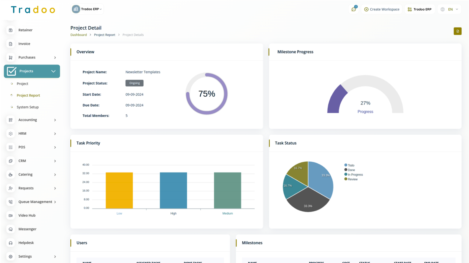 Get an overview of projects, tasks, bugs, and team members. Visual insights track progress, while the top due task section keeps you informed of pending priorities.