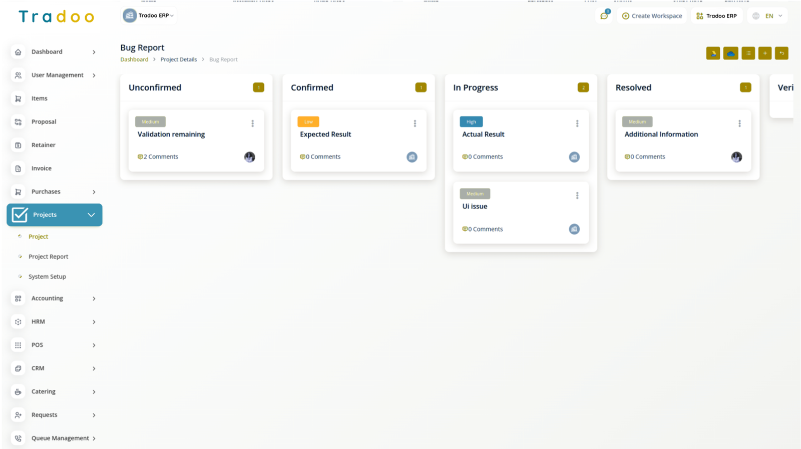 Create new bugs and assign them to appropriate users, ensuring each bug is marked with the correct priority level. Provide a detailed description of each bug in the text box. The status of each bug can be updated through an intuitive drop-down menu or managed using the Kanban drag-and-drop system for easy tracking and resolution.