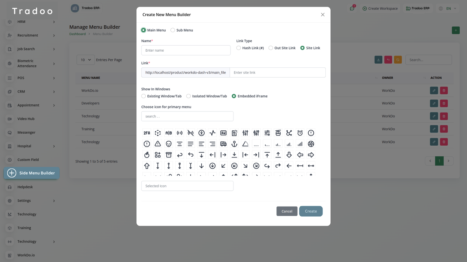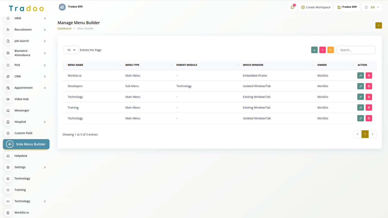 Easily create and manage side menus using the Create button. Customize, edit, or delete menus as needed. Sidebars can be configured from both the company and super admin sides, with super admin-enabled menus visible to all companies for consistent navigation.