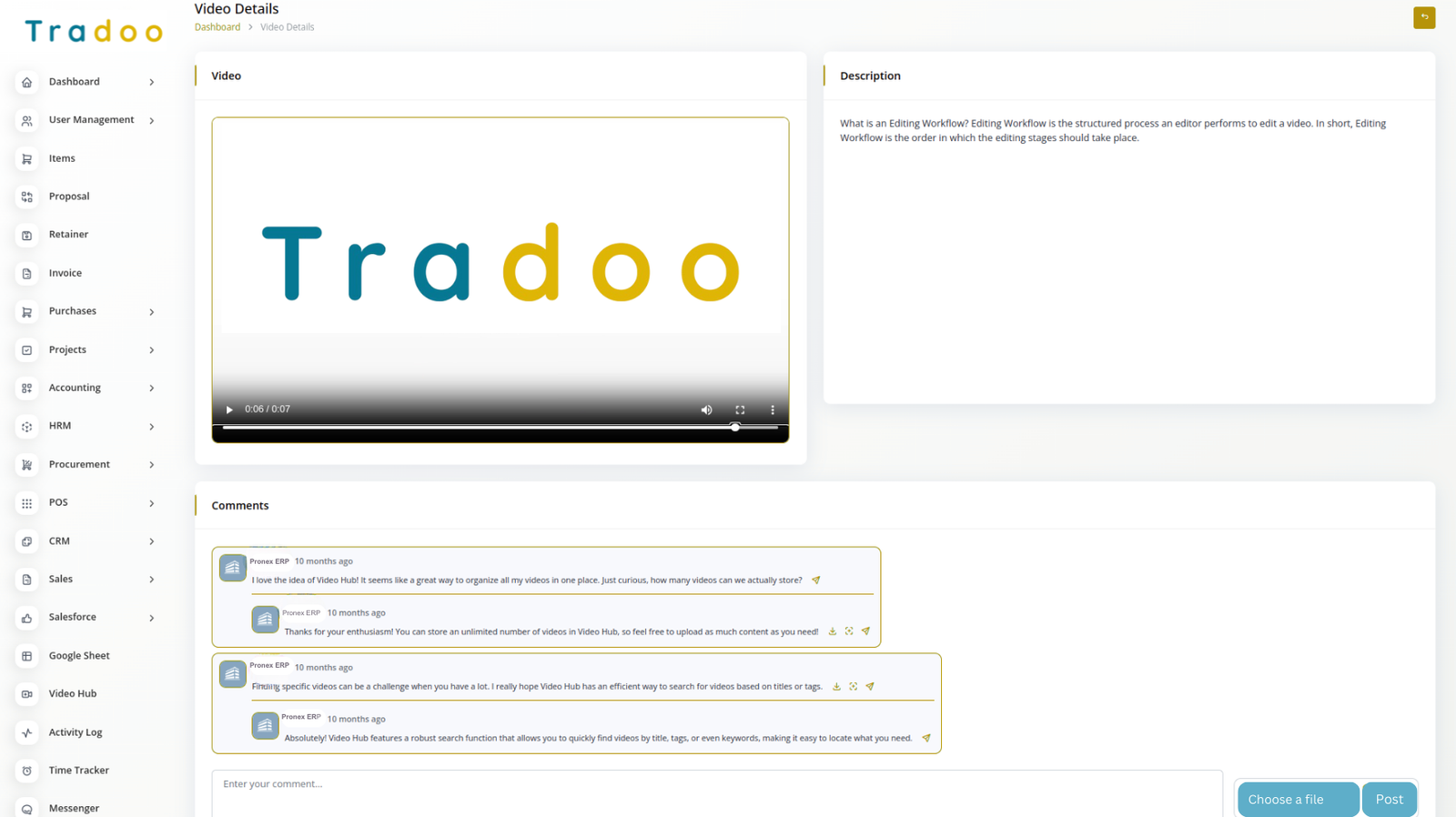 Access videos easily by clicking on their thumbnail or title. On the video page, you can watch the video, read its description, and engage by adding comments or attaching files. Enjoy seamless viewing and interaction with all video types.
